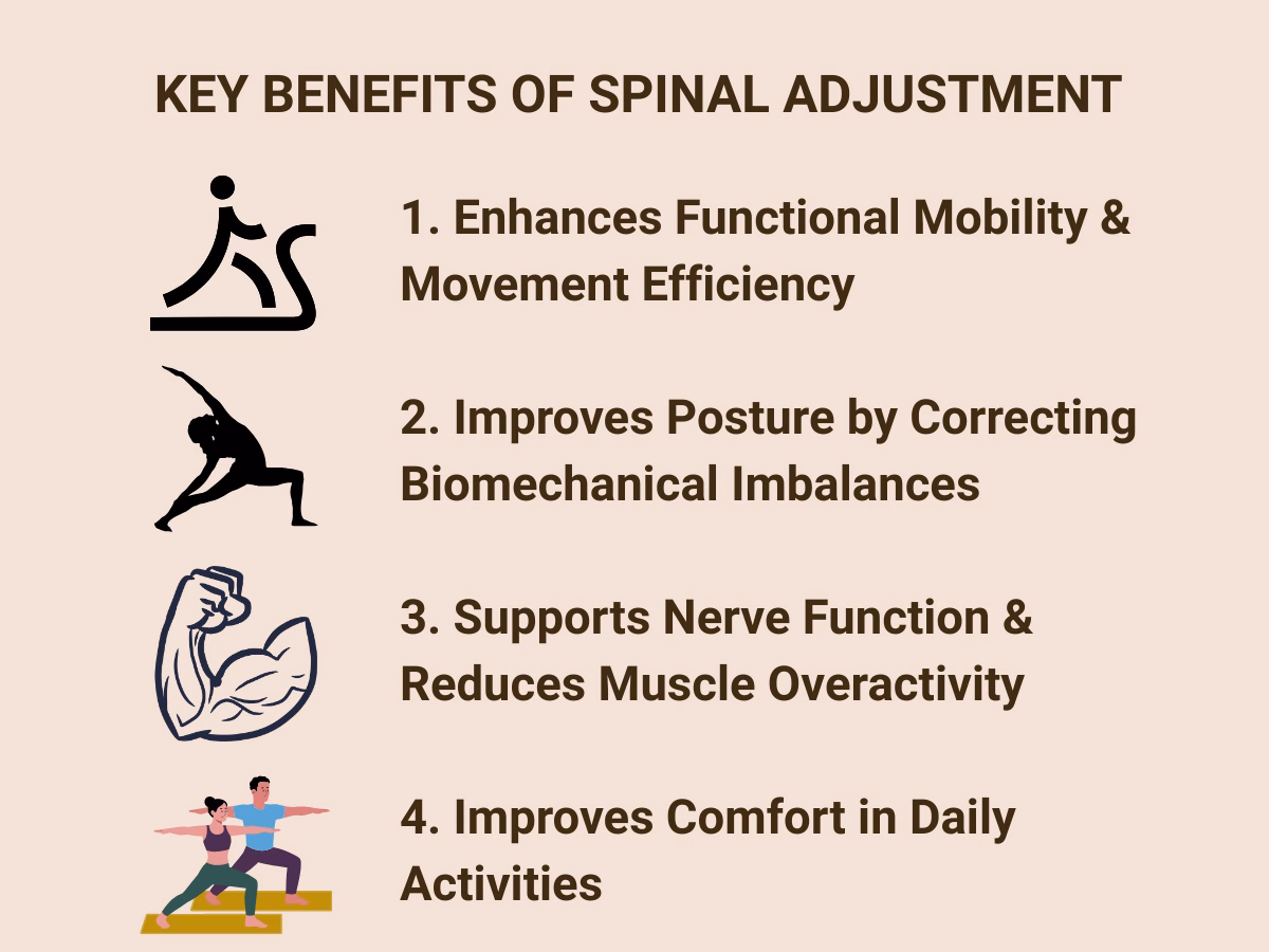 Unlike general massage or stretching, spinal adjustment targets the root cause, mechanical dysfunction, to improve both posture and movement efficiency.
